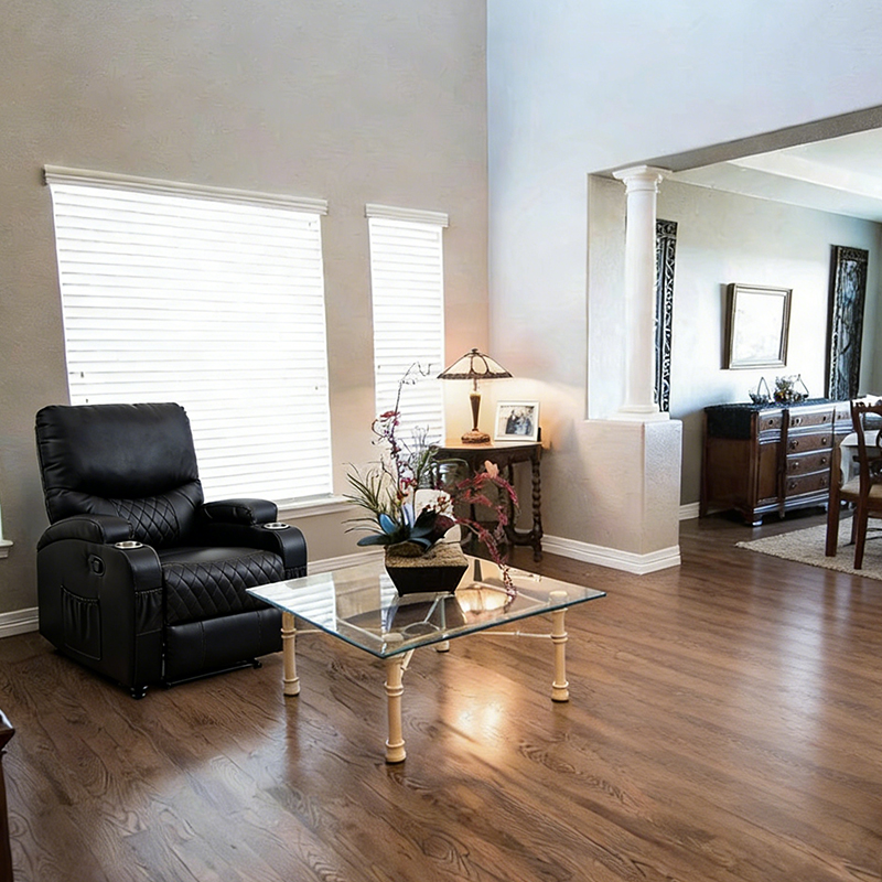 Anji Xuanbo Household Co., Ltd. Home / Products / Recliner Sofa / Manual Recliner / Overstuffed Faux Leather Manual Recliner Chair with Two Cup Holders